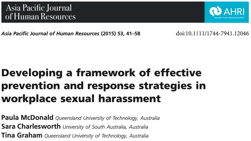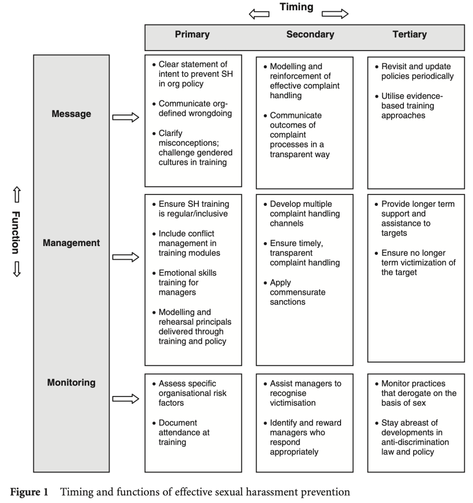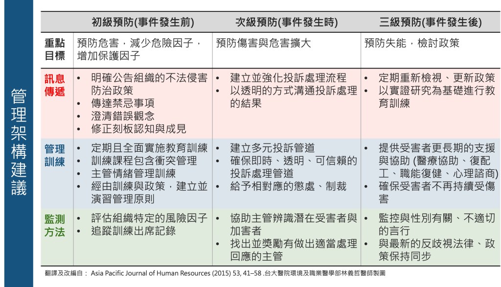 一篇刊登於《亞太人力資源雜誌》(Asia Pacific Journal of Human Resources)的論文(原文),文章整理了一個以時間(Timing)和功能(Function)為架構的表格,對職場性騷擾的預防,提出三級預防策略。